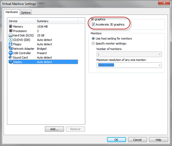 - Ensure that you set the Virtual Machine Settings to Accelerate 3D Graphics in the Display settings for the VM. Note that the VM must be off for you to set this.